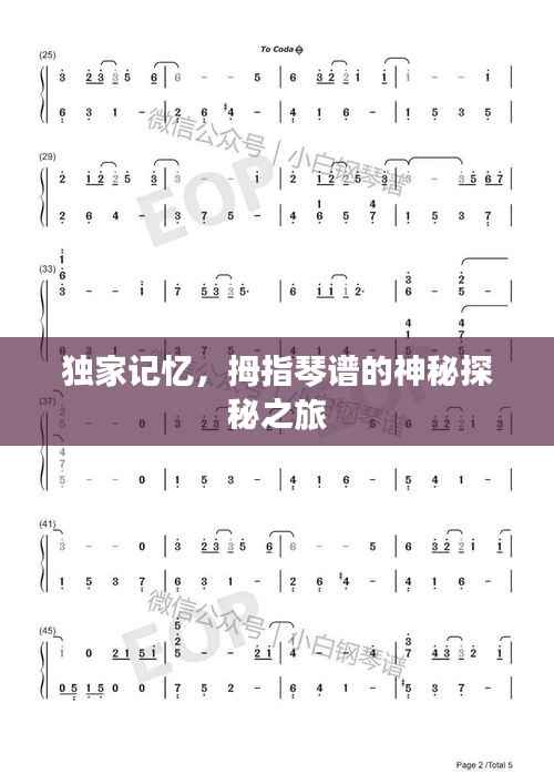 “独家记忆”象征着每个人内心深处的独特故事和情感体验,每个人的生活经历、情感历程都是独一无二的,而音乐,作为一种无形的语言,能够完美地诠释这些独特的记忆,拇指琴谱,作为演奏音乐的重要载体,更是承载了演奏者的个人情感和独特理解,它不仅仅是一份简单的琴谱,更是演奏者内心世界的真实写照。